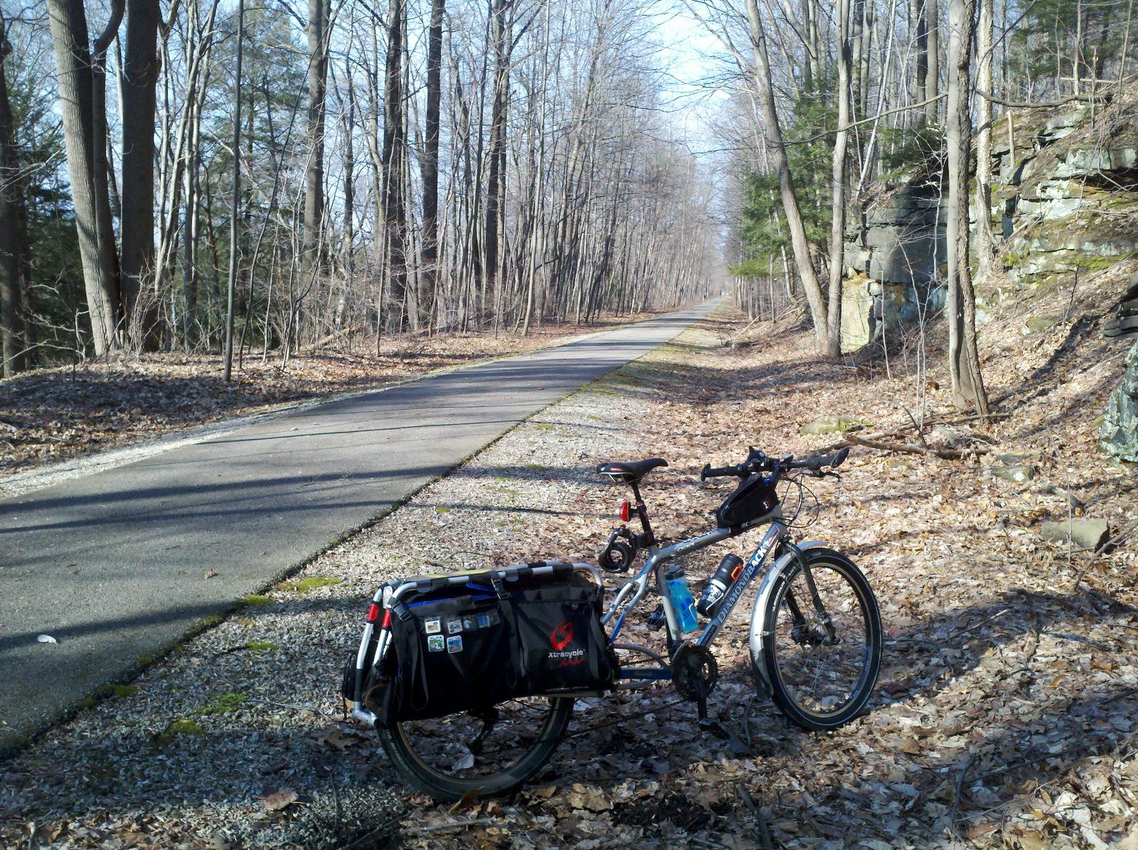 I headed back out of town on Fairchild Avenue, and caught the Summit County Bike and Hike Trail where it starts near Stow-Munroe Falls High School. I followed it to where it meets Barlow Road outside of Hudson, then took Barlow Road west to go browse a bit at Appalachian Outfitters in Peninsula. After that, I backtracked to the Bike and Hike and headed north. This is one of the most beautiful sections of this trail, where the former railroad bed cuts through a hillside, creating a rocky canyon wall, with sunlight streaming through the tree branches.